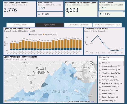 This is the link to the Arrests that have been filtered for just those that are opioid related. The change in law in Virginia regarding the use and possession of Cannabis impacted the long term trend analysis, the analysts had to re-assess the types of narcotic possessed at the time of arrest for the previous 10 years to remove the impact of Cannabis on the trend. Details can be found in the FAACT dashboards managed by the Commonwealth of Virginia.